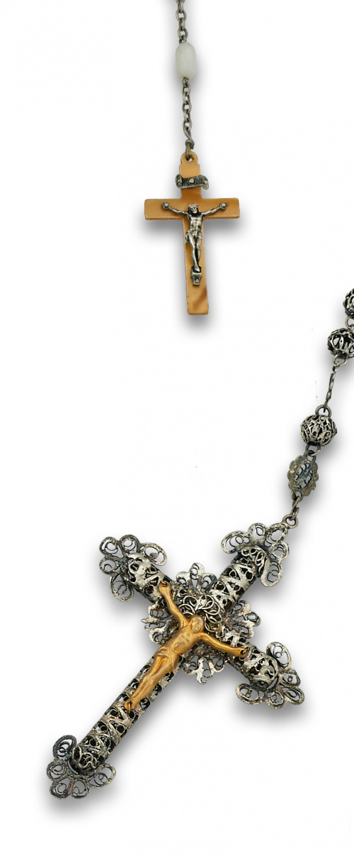 Dos rosarios de pps s XX :uno con cuentas de nácar ovaladas y otro en filigrana de plata.
