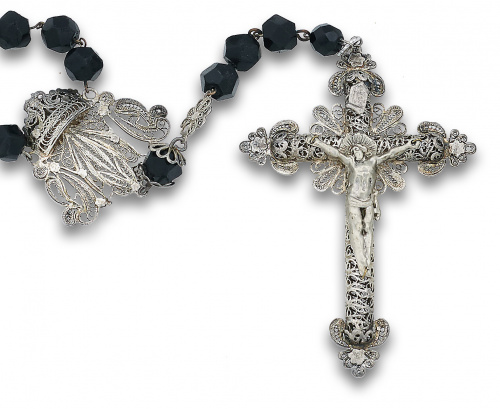 Rosario s.XIX con azabache facetado y filigrana de plata.