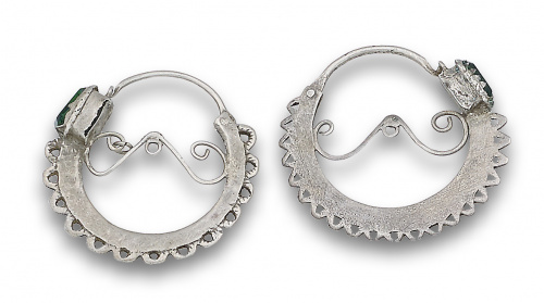 Pareja de arracadas leonesas s.XVIII-XIX en plata con vidrios verdes .