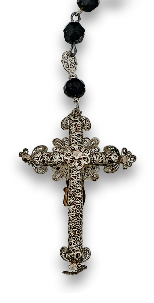 Rosario de azabache y plata s.XVIII con cruz de filigrana de plata y vermeill.