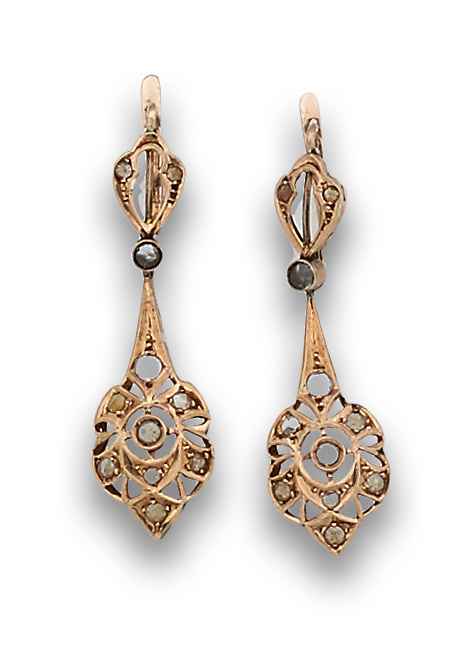 Pendientes largos s.XIX de zafiros blancos, calado ,en oro de 18k.