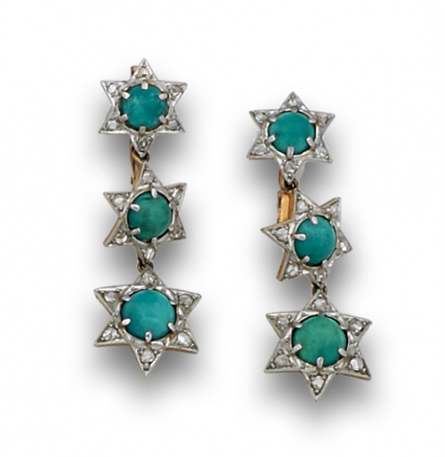 549. Pendientes largos de pps s XX con tres estrellas de turquesas y diamantes en tamaño creciente.
