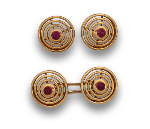 Gemelos dobles años 40 con cabuchones de rubíes y circulo calado a modo de diana. En oro de 18K