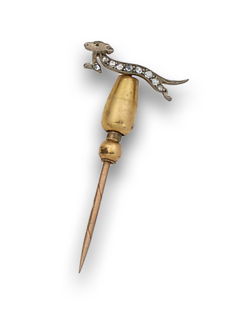 Alfiler de pps s XX con perro Dachshund de diamantes en oro de 18K.
