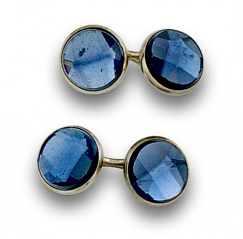 Gemelos Krementz dobles años 40 con vidrios azules facetados en metal dorado.
