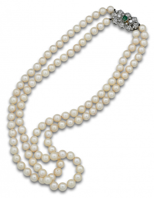 567. Collar años 30 de dos hilos de perlas cultivadas chocker de 9 mm con cierre de brillantes y esmeralda central años 30.