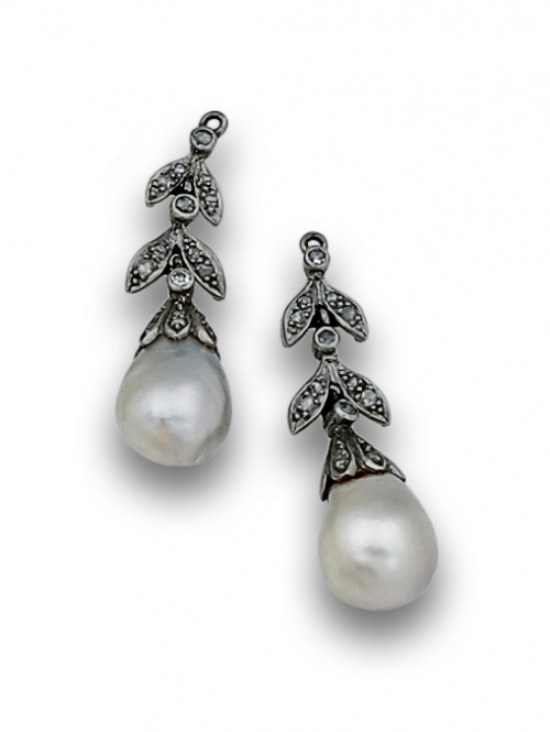 568. Pendientes largos s.XIX con perilla de perla barroca ,posiblemente naturales,y hojas de diamantes en platino.