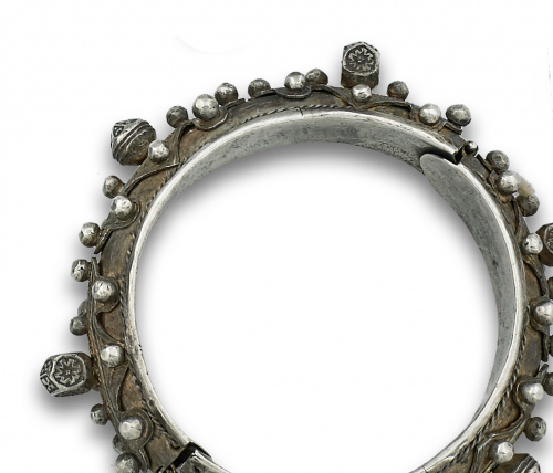 Brazalete rígido oriental en plata con motivos grabados y en relieve.