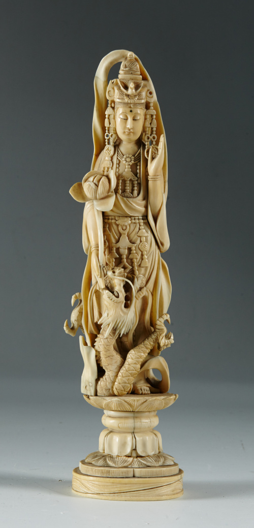 Medidas: 33,5 cms. Figura de la diosa budista de la compresión. Aparece acompañada de un “rayou” dragón japonés. La diosa lleva en su mano derecha una flor de loto, elevándose de la peana circular.