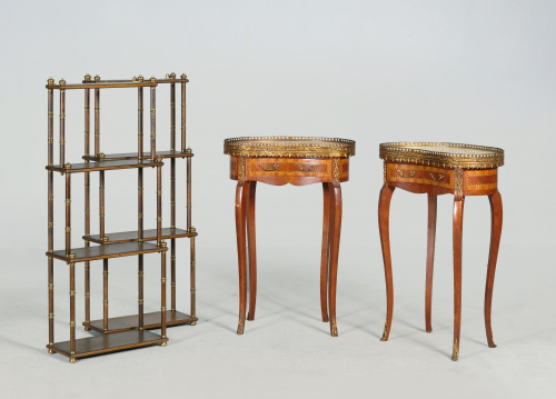 Pareja de mesas de riñón de estilo Luis XV, en madera de caoba con marquetería, aplicaciones de latón y tapa de mármol.S. XX.