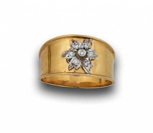 Sortija con flor de circonitas en banda ancha de oro amarillo de 18k.