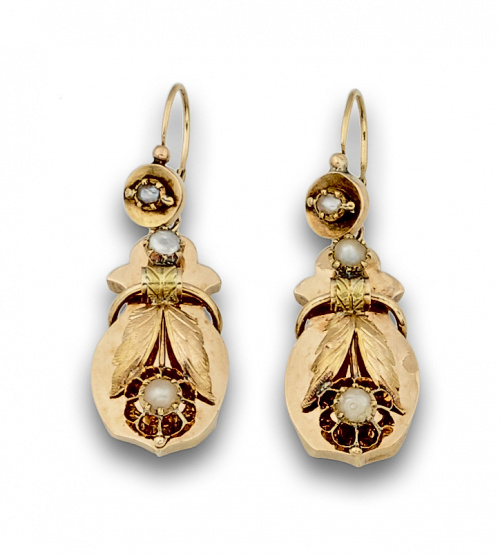 2. Pendientes largos s.XIX con hojitas y flores de oro de 18K con perlas, sobre placa geométrica que pende de botón.
