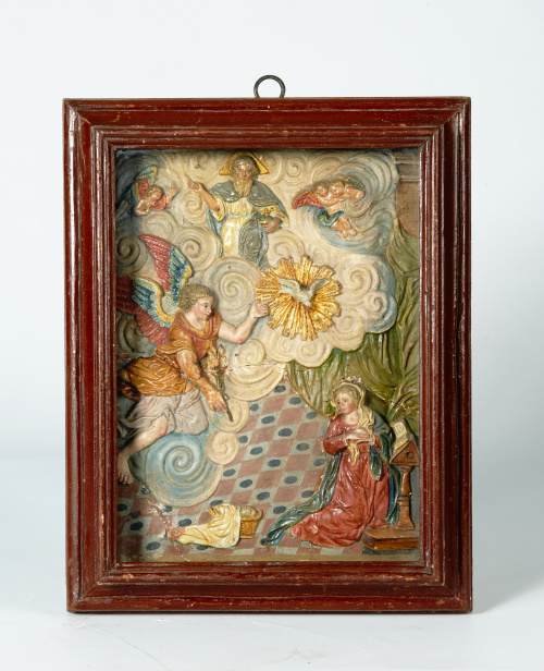 479. “Anunciación de la Virgen con el Padre eterno”, Placa en barro policromado.Escuela española o portuguesa ff. del S .XVII pp. del XVIII..