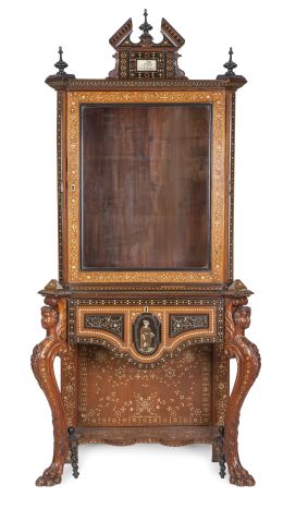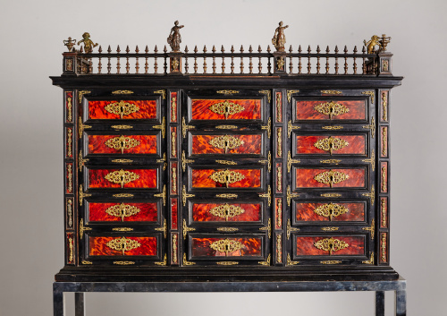 Papelera de madera ebonizada, carey, metal dorado, nogal y marquetería geométrica a los lados.Trabajo Hispano-flamenco, S. XVII.