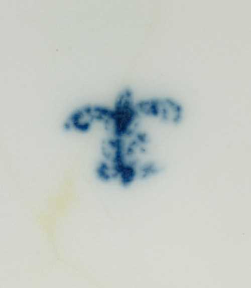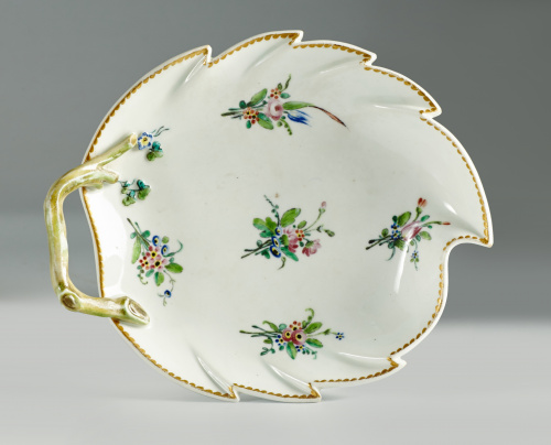 Entremesera de pasta tierna, con forma de hoja y decorada con ramilletes de flores. Marcada en la base en azul de cobaltoBuen Retiro (1784-1803) .