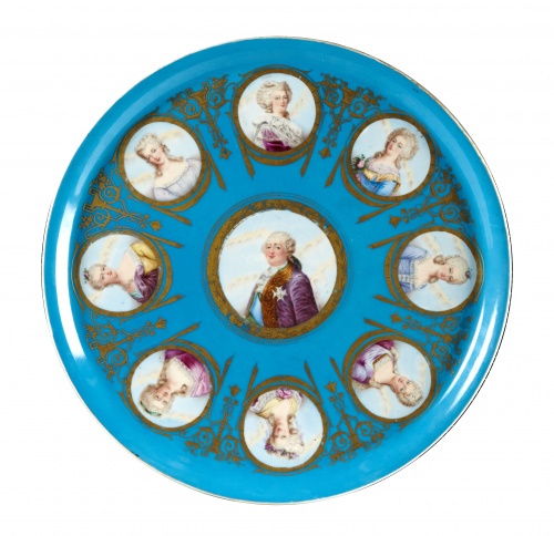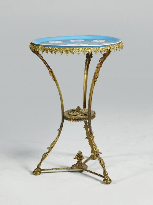 487. Velador Napoleón III en bronce dorado y tapa de porcelana esmaltada con Luis XVI en el centro y damas, marcada en la base.Trabajo francés de mediados del S. XIX..