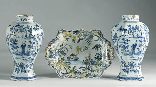 Pareja de tibores de cerámica esmaltada con decoración de chinerías en azul de cobalto.Delft, S. XVIII..