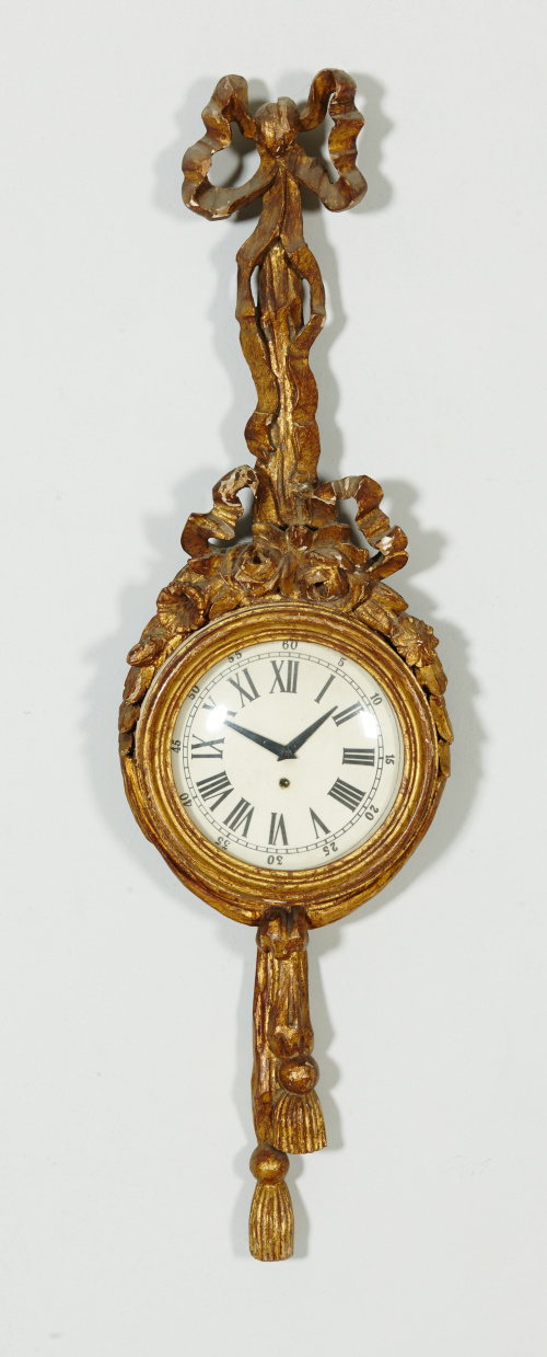 500. Reloj de pared, estilo Luis XVI, en madera tallada y dorada.