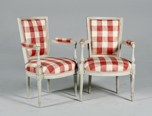 Pareja de butacas época Luis XVI, en madera lacada de gris.Trabajo francés, ff. S. XVIII.