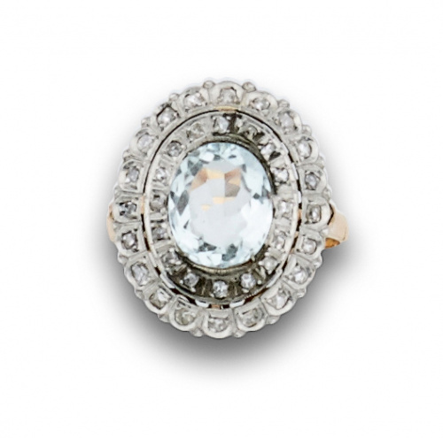 Sortija de pps s XX con aguamarina oval en doble orla de diamantes.