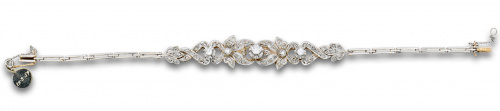 55. Pulsera de brillantes y diamantes años 50 con centros florales entre cintas y cadena de eslabón rectangular.