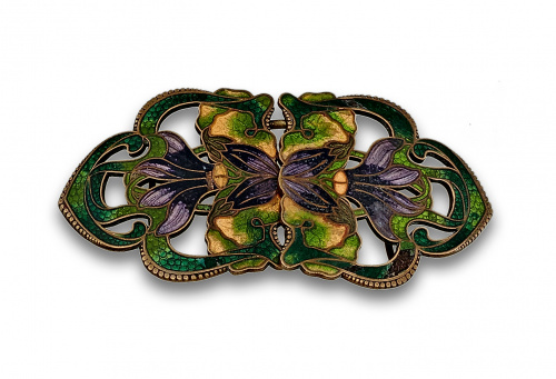 Hebilla Art Nouveau de esmaltes con lirios y hojas ,en metal dorado