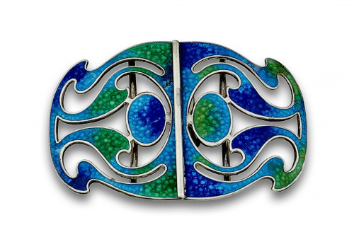 Hebilla Liberty en plata y esmaltes de tonos verdes y azules. Con punzones ingleses.