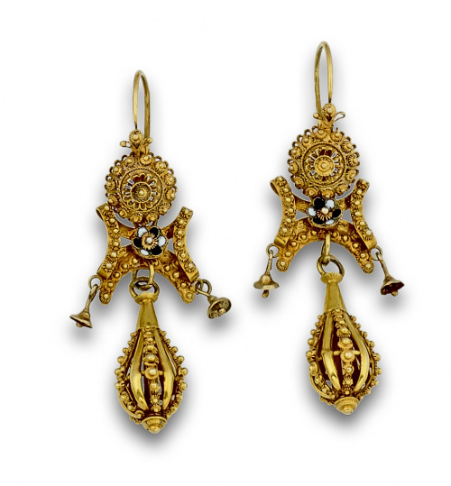 Pendientes largos extremeños s.XIX con tres cuerpos en filigrana de oro de 14 K y esmaltes