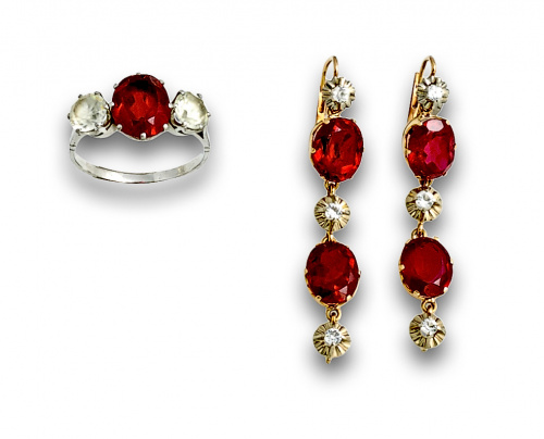 818. Sortija y pendientes largos con símil de rubíes y circonitas .