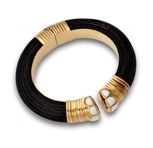 137. Brazalete ancho firmado MONTEJO con diseño de patas de elefante, realizado con pelo de elefante y remates de marfil ; en oro de 18K.