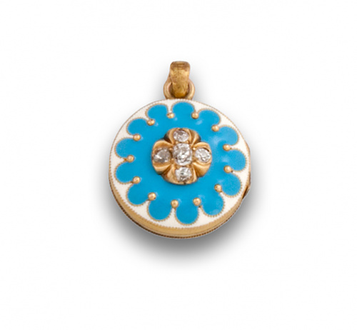 13. Colgante portafotos de pps s XX en esmalte color azul y marfil ,con flor de btes central.