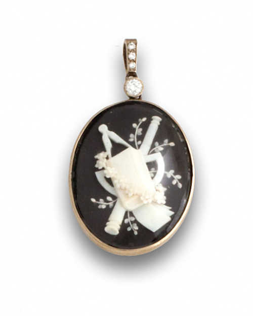 Colgante con marfil de escuela de Dieppe sobre ébano y brillantes pps s XIX .