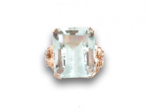 33. Sortija años 40 con aguamarina de 24 ctes y corazones de btes a los lados.