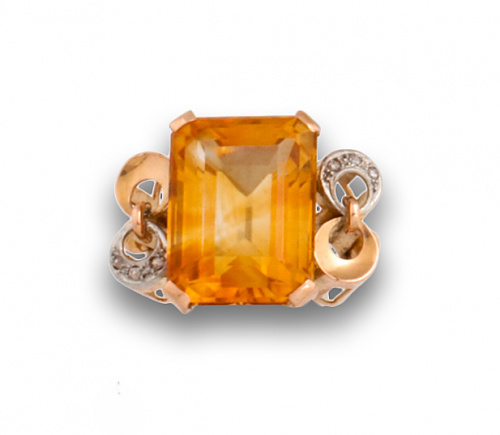 34. Sortija chevalière años 40 con gran cuarzo citrino de talla rectangular y aros con oro y diamantes a los lados.