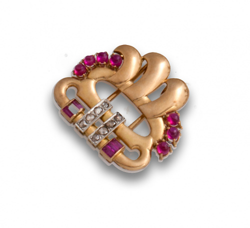40. Broche clip de diamantes y rubíes sintéticos años 40 con diseño de formas geométricas y hojas onduladas.
