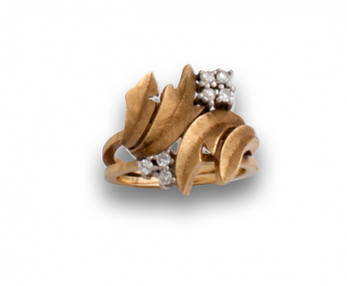 42. Sortija años 50 con hojas de oro mate y brillantes.