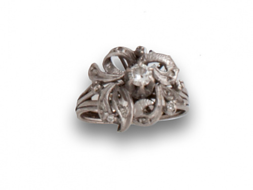 Sortija flor con brillante central de 0,20 ctes aprox y brillantes alrededor.
