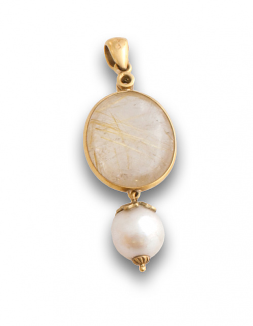 Colgante con cuarzo hialino, perla y brillante en montura de oro de 18K.