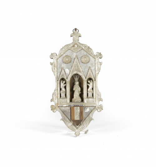 Placa devocional de madreperla de decoración grabada y aplicada, con la Inmaculada bajo un arco.Recuerdo de Tierra santa, S. XIX.
