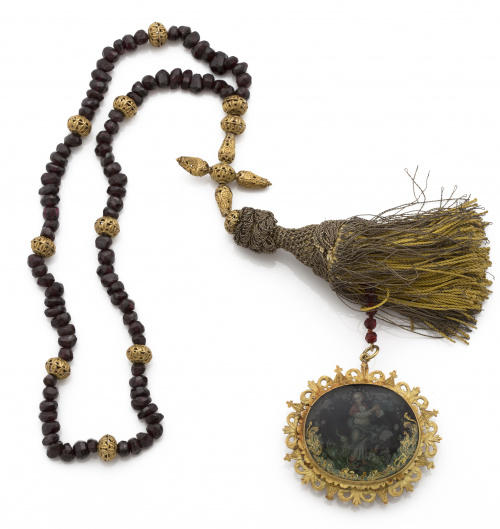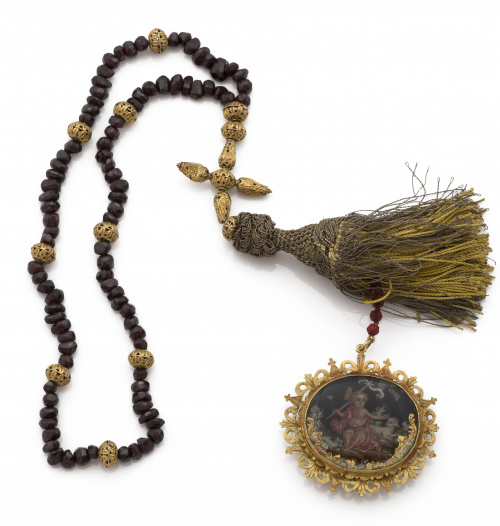 Con collar de granates facetados y cuentas y cruz caladas de oro,rematado en borlón de seda e hilos de oro. Medidas colgante:6,5 x 7 cm Longitud collar:58 cm.
