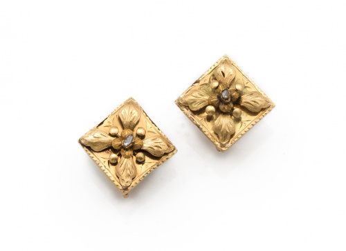 17. Pendientes romboidales s.XIX con flor de pétalos grabados aplicados con diamante central