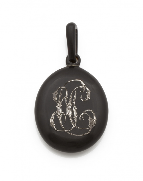 Colgante portafotos de pp s.XX en baquelita, con iniciales de plata incrustadas en frente.