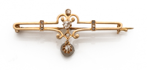 Broche barra de ffs s.XIX con diamantes y en motivo central y colgante.