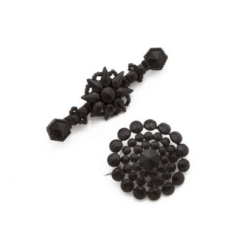 Dos broches con piezas facetadas de cristal negro de pp s.XX; circular y estrella sobre barra