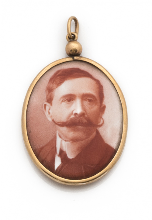 Colgante oval de pps s XX en oro de 18K con retrato de caballero esmaltado.