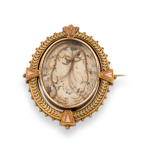 Broche guardapelo s.XIX con marco oval en oro bicolor de 18K con decoración grabada de guirnalda.