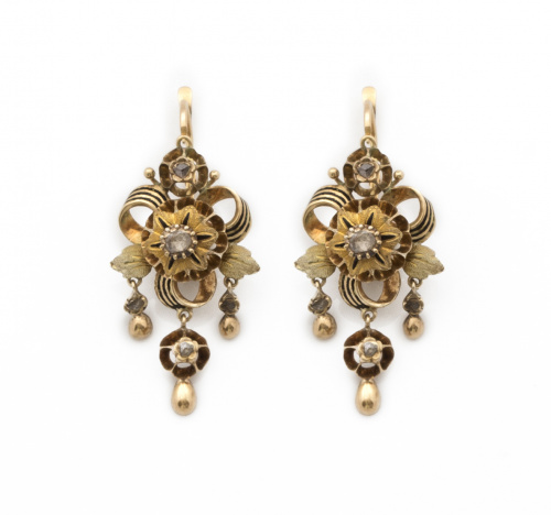 Pendientes s.XIX con flores de diamantes de talla rosa, entre cintas entrelazadas de esmalte en oro mate de 18K.