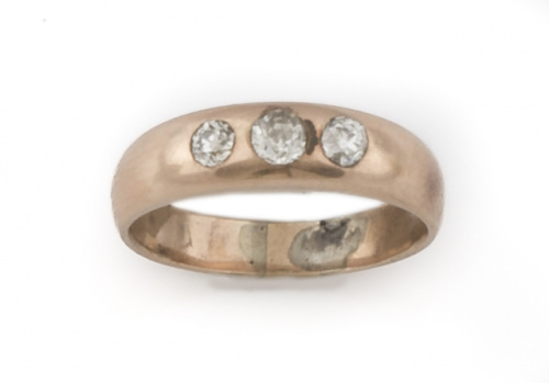 14. Sortija tresillo de brillantes de talla antigua que suman 0,35 ct aprox en oro de 9K.