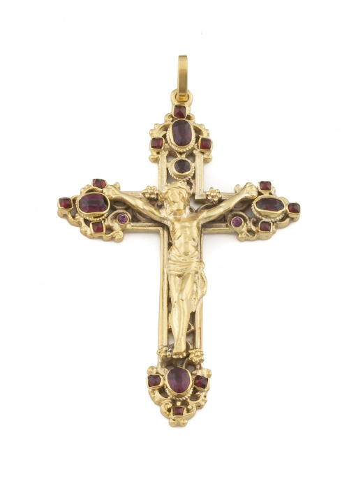 15. Crucifijo en plata dorada con granates, en brazos calados con decoración floral.