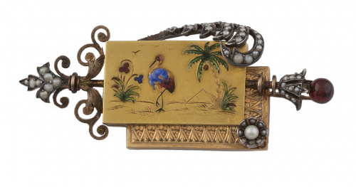 Broche de pp s.XX con esmalte de inspiración egipcia en rectángulo enmarcado por motivos a modo de flecha y plumas de perlas finas.